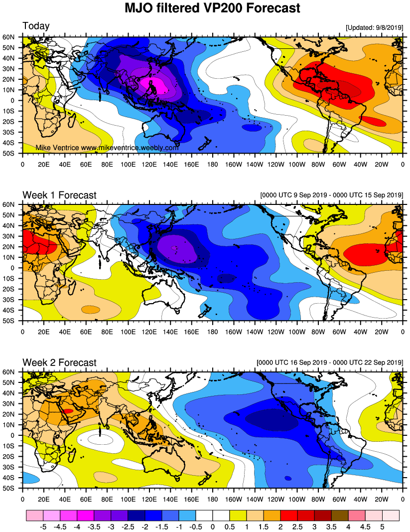 Once again I am seeing some indications of Hemispheric Patterns that could bring favorable conditions to the Tropical Atlantic in about 10 days or so and may well bring an active period as September ends and October begins. Two charts I look to suggest lower pressures as well as rising air and thus better conditions for tropical thunderstorms to develop with a Convectively Couple Kelvin Wave arriving around September 18th. Now that dust from Africa is no longer a problem and warmer sea surface temperatures are present across the Gulf, Caribbean and Main Development Region of the Atlantic, a burst of tropical activity could be in the cards. We will see.