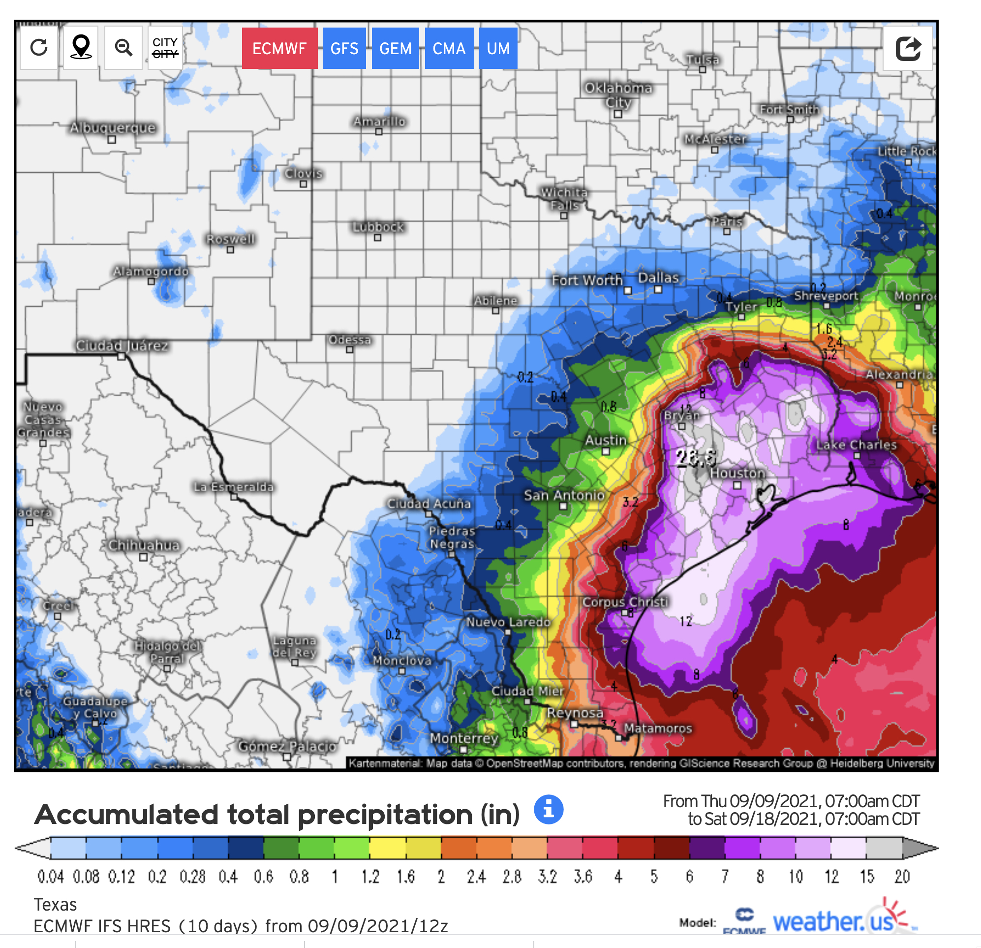 GFS targets the coast and east, GEM rain dump focuses on San Antonio, UM is lighter and offshore. Bears watching during the weekend and early next week before there's confidence in the forecast.