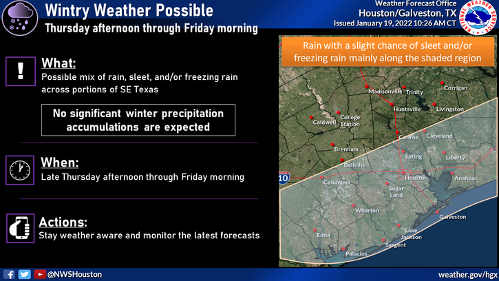 Any mention of highway 105 ?txsnowmaker wrote: ↑Wed Jan 19, 2022 7:20 pm KHOU mentioning possibilities of a rain/snow mix north of I-10 tomorrow night and a few flurries Friday morning.