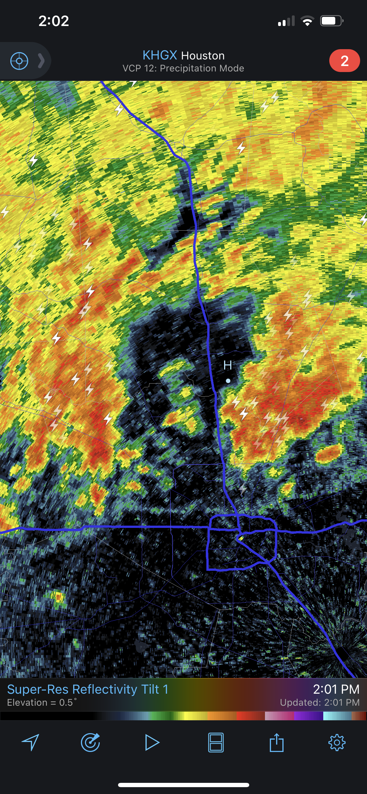 Radar is showing rainfall rates of up to 2 inches an hour moving into metro Houston.