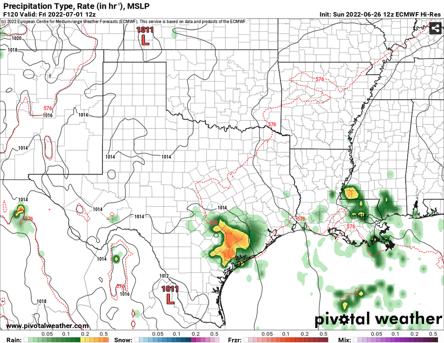 don wrote: Sun Jun 26, 2022 1:52 pm Even with the Euro not showing development, its painting some hefty rainfall totals with the tropical low.