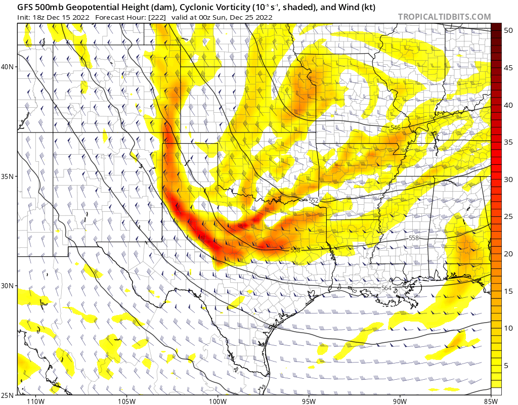 While not the best setup for snow for us,such setups have produced snow in the past around here.There will be energy moving in the northwest flow aloft with the trough.Models are showing a coastal trough trying to develop as the system digs around Christmas.We just need the system to dig a little more and slow down.The December 4th 2009 snowstorm had a similar setup to what the models are showing around Christmas.Temps don't look to be an issue just need enough lift.For a more significant event you would want the vorticity to come in around the 4 corners region and dip south of El Paso to produce a decent gulf low.Will be keeping an eye on this to see how models trend with the system over the next week.