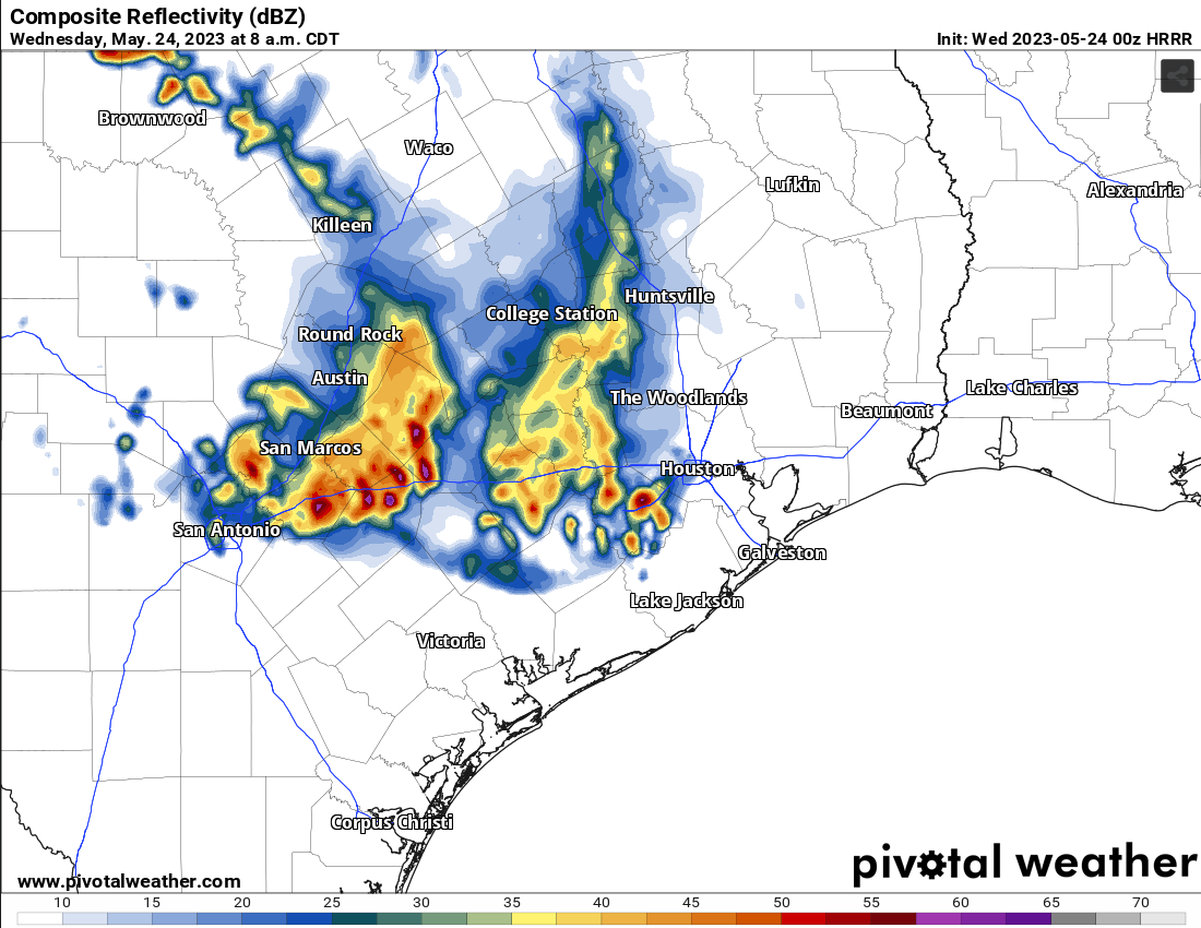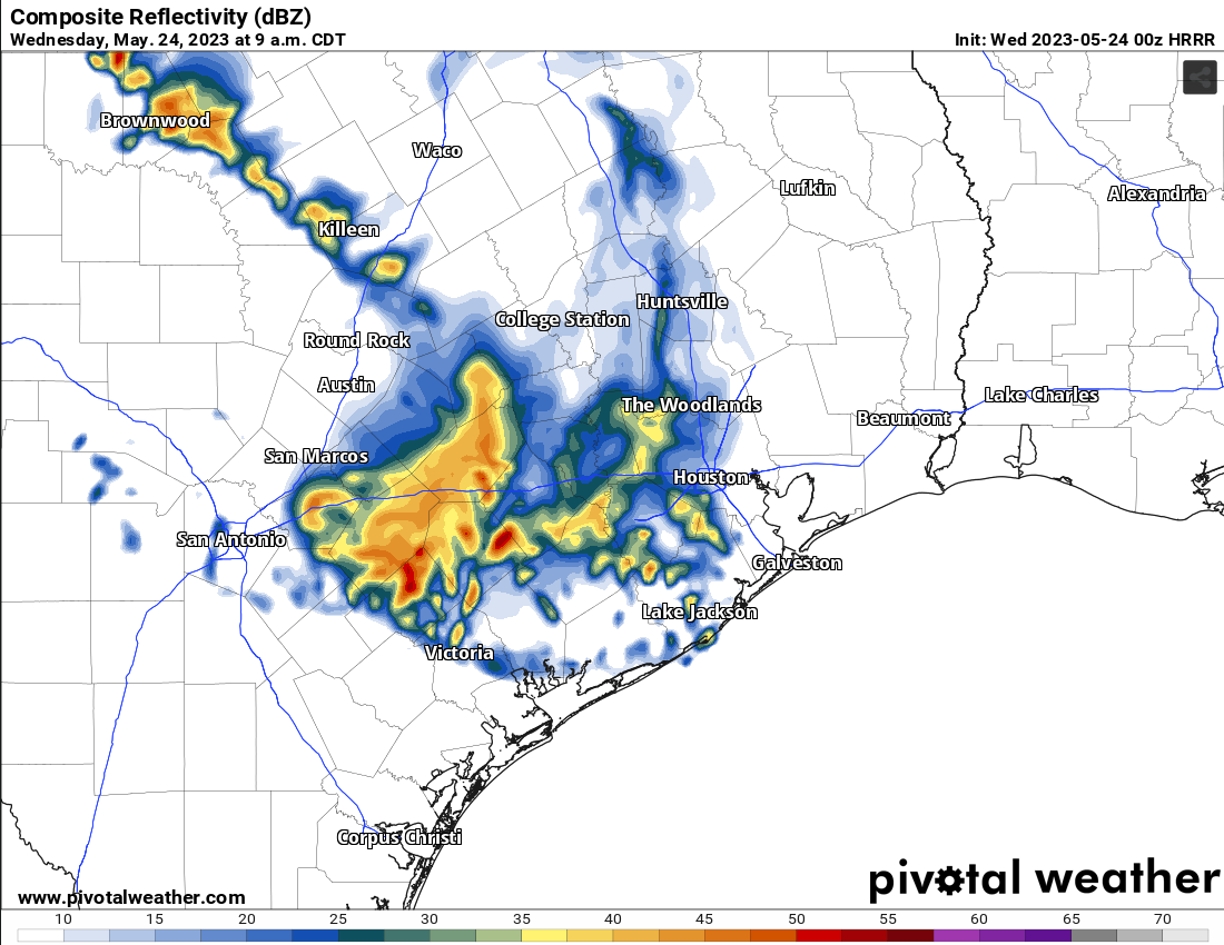 May be a rainy morning tomorrow for areas west of I-45.As a weakening MCS moves in.