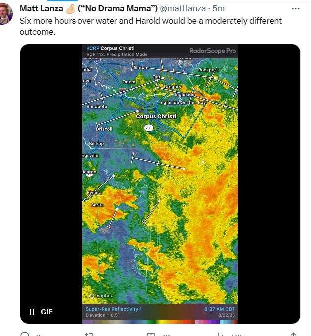 Looks like a partial eyewall has formed in #Harold right as it prepares to make landfall south of Corpus Christi, Texas. Thankfully it's still asymmetric and open to the south. I would expect some wind gusts over 60 mph along the coast to the north of the landfall point. pic.twitter.com/7Ut9Vo5rag