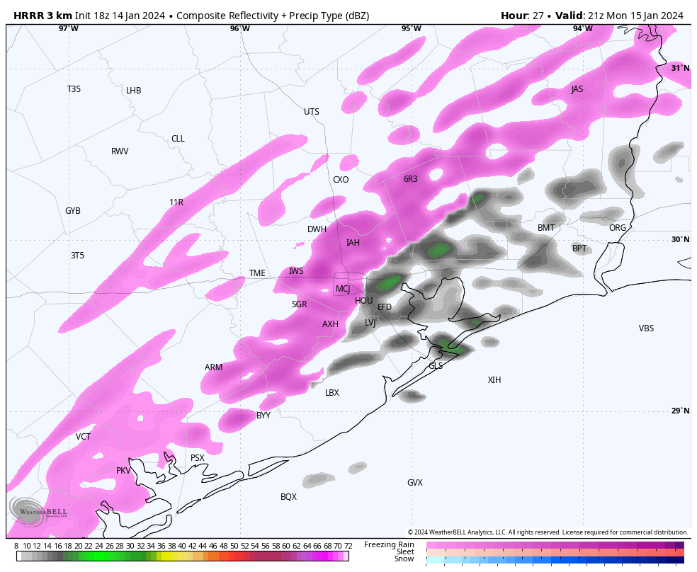 NWS has Metro Houston (Galleria area) at freezing or below from midnight tomorrow night through 12 pm on Tuesday. Then from 7 pm Tuesday until about 10 am Wednesday. We can handle that. For those in this part of the area, can’t imagine much of an issue here unless perhaps driving on freeway overpasses etc.