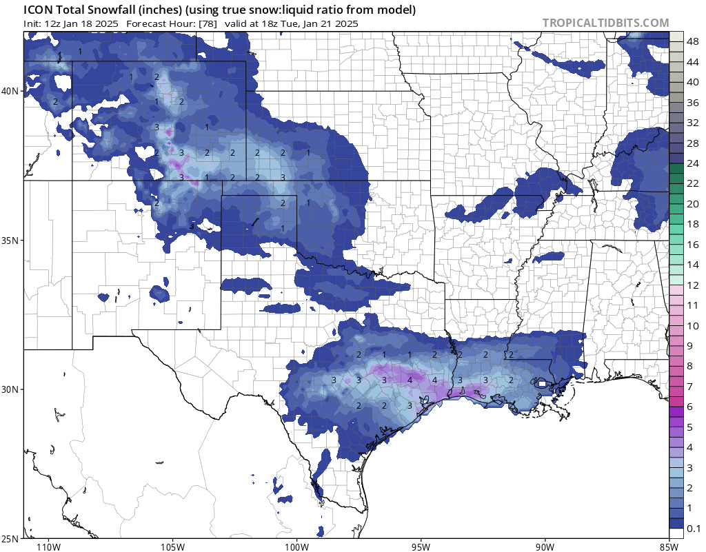 Hi, do you have a graphic? This close to the event, do you think there will be significant changes?Stratton20 wrote: ↑Sat Jan 18, 2025 11:35 am 12z Euro definitely increased snowfall across se texas, 4-6 inches on 06z run to now 5–9 inches across a good majority of se texas, and that falls on top of ice and sleet