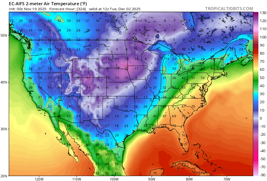 Models are more aggressive today for cold late month into early December. Extreme cold could be on the table.