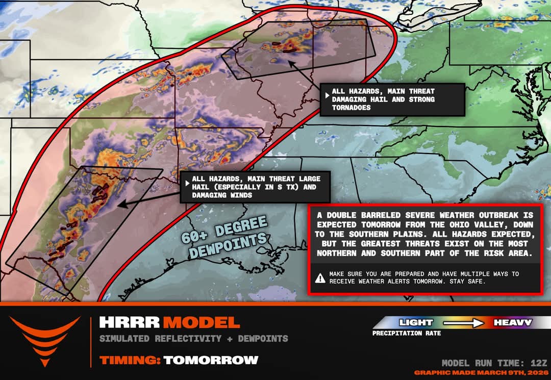 DOUBLE-BARRELED SEVERE WEATHER OUTBREAK likely tomorrow PM, March 10