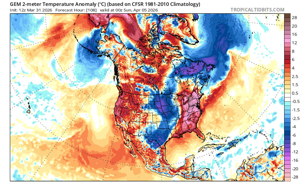 As progged last week on upper level and temp. anomalies - Alaska is heating up by April 4, so there's a better chance at a strong FROPA and line of storms reaching SETX. The only fly in the ointment is a late Saturday arrival that could diminish rainfall.