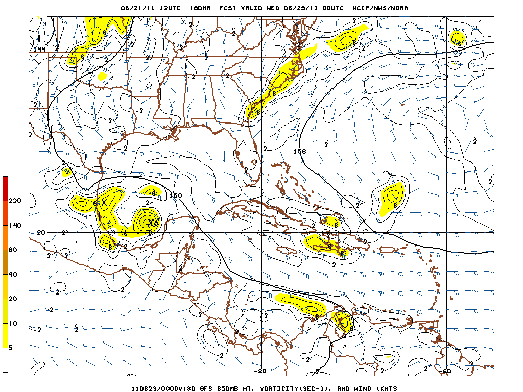 500 heights would also allow this storm to be more of a lower Texas hit at this point in time but being so far out if the storm does develop this could change. This run from the gfs is a little more promising as it isn't just picking up the lower pressure in the BOC and creating a storm out of it.