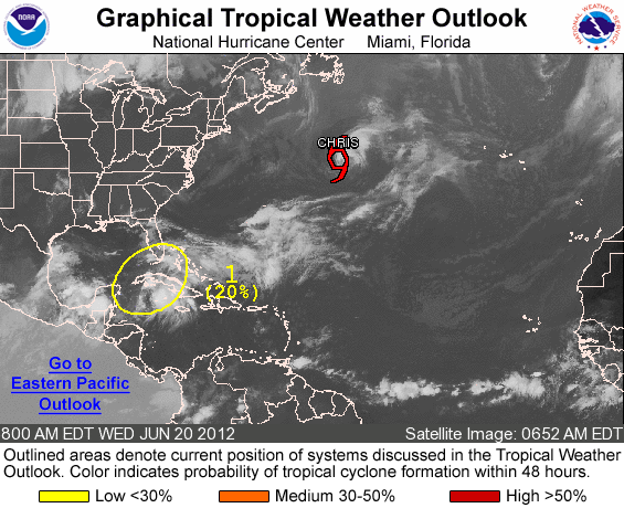 Yesterday afternoon the NHC upgraded an area of low pressure over the far north Atlantic to Tropical Storm Chris. Only twice before as the third tropical cyclone of the year formed before June 19…1887 and 1959. Chris evolved from a cold core frontal low pressure system and has gradually acquired warm core tropical features over the past 48 hours. Yesterday afternoon the system developed a compact circulation with deep convection and was declared a tropical cyclone. The system will remain over the open Atlantic and not affect any landmasses.