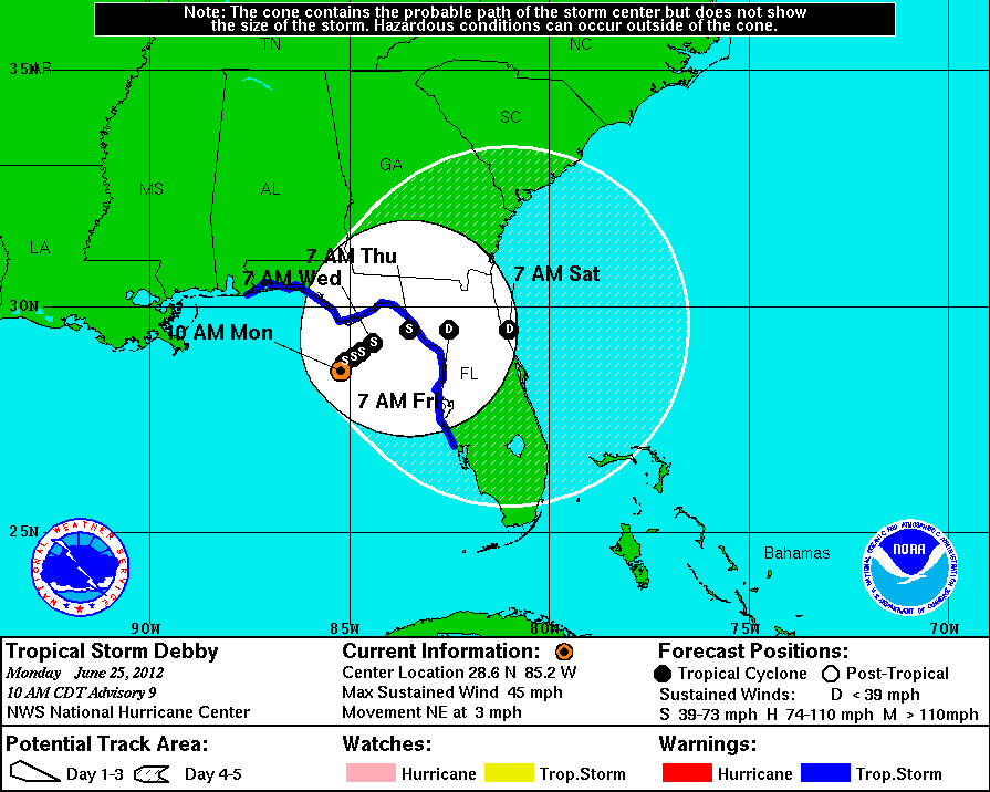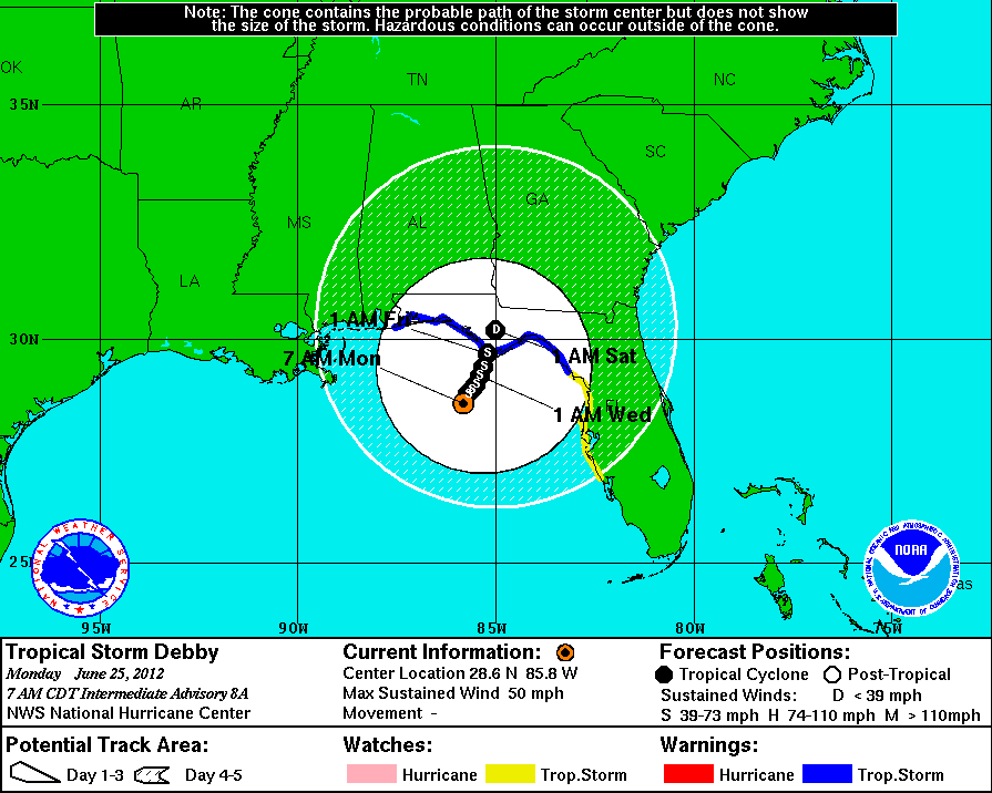Reports Tropical Storm Debby made landfall. I think its a good bet that for TS Debby we need to follow the GFS - and the NHC has followed suite and jumped on the GFS bandwagon. It will cross Florida and go out to see.