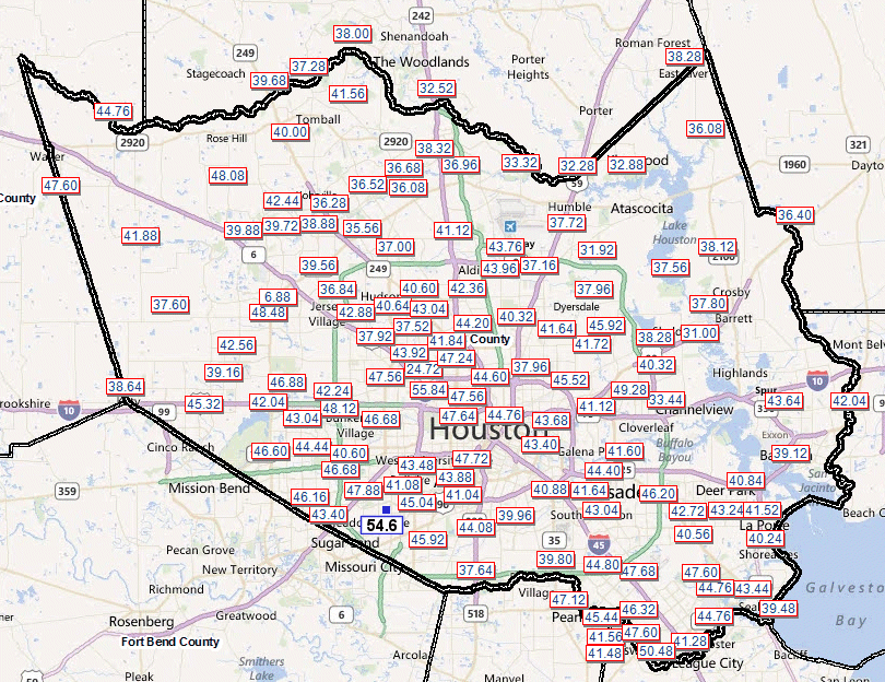 I've measured 54.6" at my home in Westbury (off Hillcroft just south of Brays Bayou). It's on the map below in the blue box between the southwest corner of 610 and the southwest corner of BW 8.