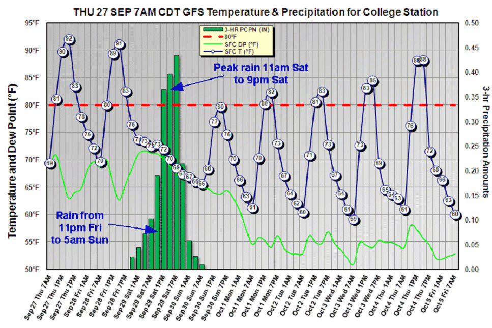 I made a meteogram for College Station for a co-worker who is heading up for the game. Not a pretty weather day on Saturday. Looks like the rain starts late Friday evening and lasts until just before sunrise on Sunday. Heaviest rain Saturday afternoon (12pm-7pm). Model indicates about 1.5 to 2” total rain during the event. Note that the temperatures on Saturday may be falling into the 60s during the afternoon (cool and wet).