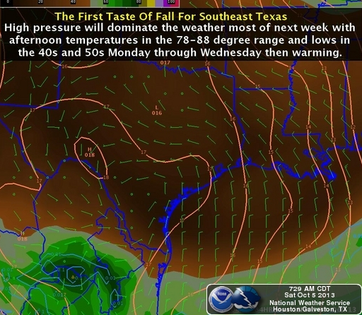 Who is ready for some cooler air? The front is making progress across the Lone Star State this morning and should clear the Coast late tonight. Tomorrow will be a much different day with breezy NW winds to near 25 mph and very comfortable temps in the mid 70's. Once the low clouds clear out and much drier air works in, temps should easily fall to the upper 40's to low/mid 50's across the area tomorrow night into Tuesday. It appears an active pattern may develop as the Fall westerly's kick in and fronts become a bit more active with a Pacific front next weekend and perhaps a stronger Canadian front in the longer range around the 20th of October, +/- a day or so. Who knows? We may see that first 'blue norther' of the season near Halloween.