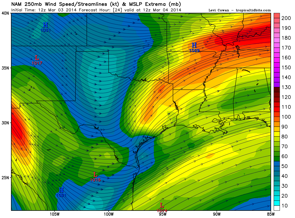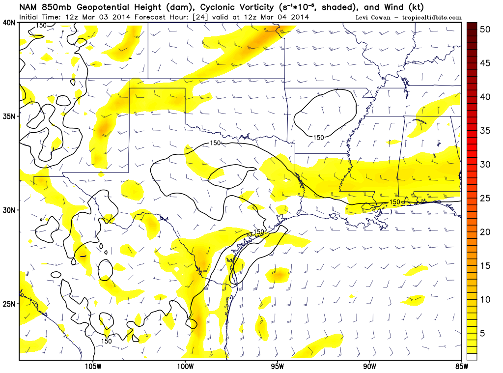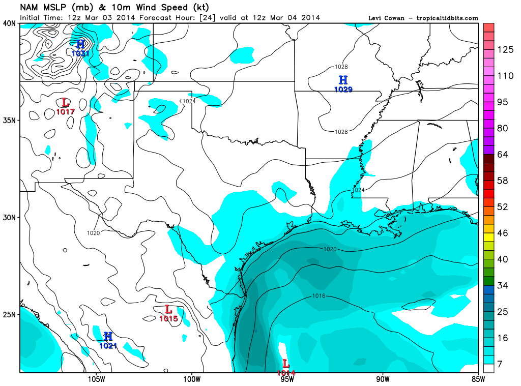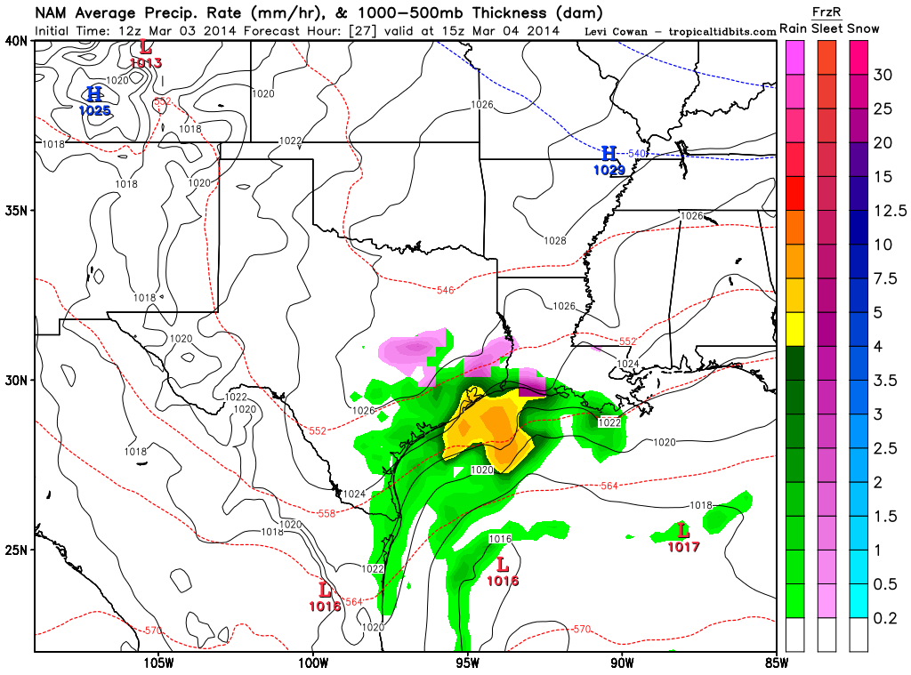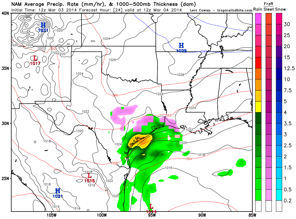 The 12Z NAM/WRF is suggesting a Coastal Low/trough developing near Matagorda Bay with convective precip as well as frozen precip developing tomorrow morning across portions of Central and SE Texas.