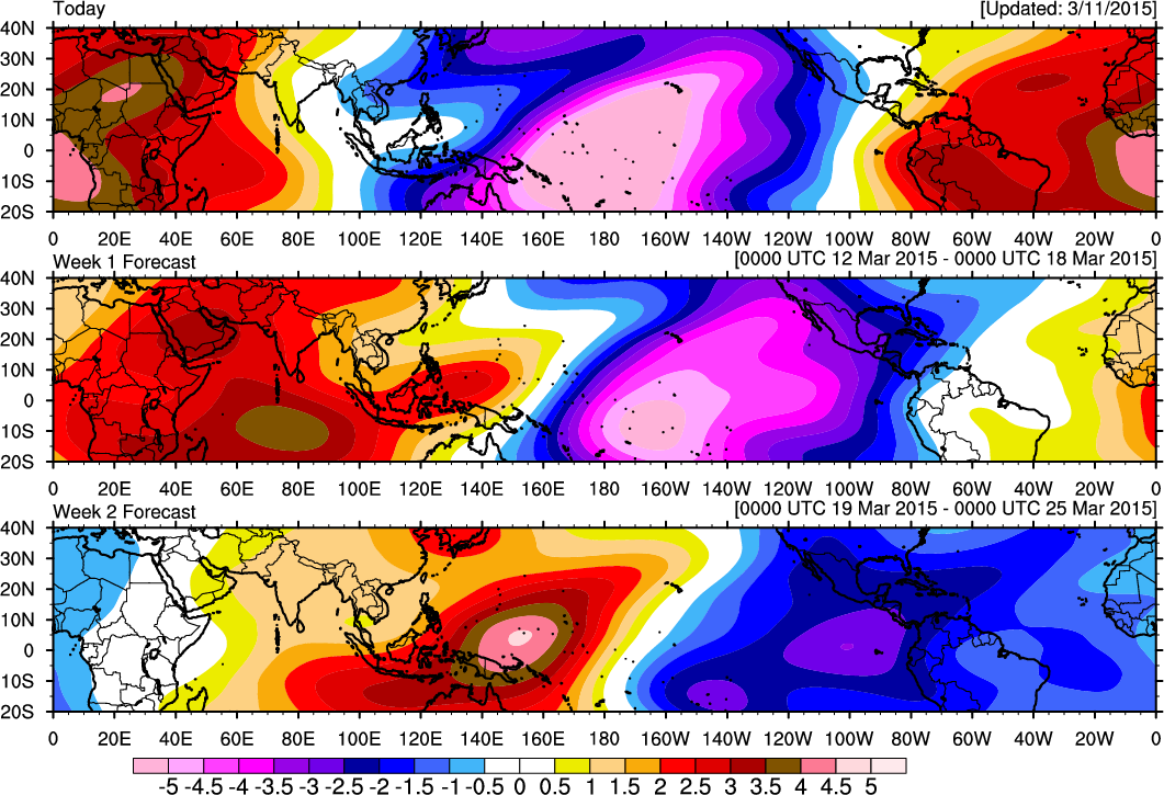 It's beginning to look like that NW Gulf low is shifting a bit more to the N. It is also worth mentioning that we could see a similar pattern next week as another Baja low develops and a very impressive MJO pulse nears the Eastern Pacific. The MJO is expected to reach near record territory in Phase (sigma) 7 later next week and the teleconnection indices suggest a strongly negative EPO/AO/NAO regime developing. Typically that signals a wet pattern for our Region.