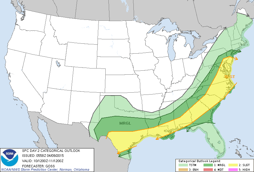 As Andrew pointed out, the parameters for potentially strong to severe storms are slowing increasing particularly during the Thursday night into Friday timeframe. The latest guidance suggests that an uncapped atmosphere with a rather impressive jet streak out of the Eastern Pacific crossing Mexico into Texas and Louisiana could develop with veering winds as well as a lower level increasing flow off the Western Gulf combining with a very moist and unstable airmass along and S of the stalled front typically spells an active weather pattern. The Storm Prediction Center has issued a Slight Risk for Severe Storms Thursday night into Friday with damaging wind and hail being the primary threat at this time.