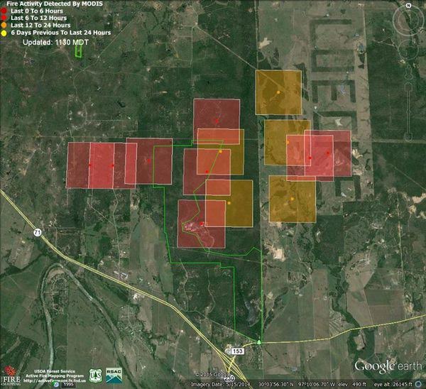 ire has grown to 1,521 acres and is actively burning NNW toward the east side of Hwy 71 near the northwest corner of Buescher State Park. This is also near the southern edge of the devastating 2011 Bastrop State Park fire. Grounds crews have good containment lines on the south and east flanks of the fire, but have been unable to contain the spread to the NNW this morning. At least 35 homes are currently being threatened.