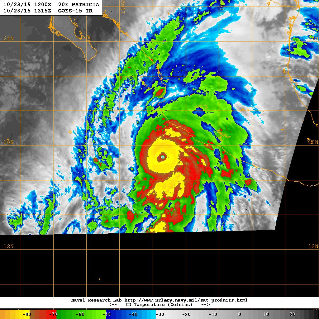 When NASA-NOAA's Suomi NPP satellite passed over Patricia on October 23 at 5:23 a.m. EDT the VIIRS instrument that flies aboard Suomi NPP looked at the storm in infrared light. Cloud top temperatures of thunderstorms around the eyewall were near minus 90 Celsius (minus 130 Fahrenheit).