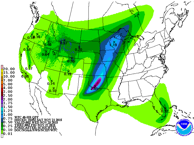 Area of disturbed weather over central America will move westward south of MX and likely develop into a tropical cyclone next week. A deep longwave trough begins to develop over the W US while decently strong ridging develops in Alaska. The GFS brings a 995mb hurricane toward western MX around Thanksgiving Day while the ECMWF is much stronger at 977mb. Both of these solutions are rare for this time of year…but the waters off the west coast of MX remain very warm given the warm phase ENSO in progress. Deep ridging over Alaska will likely dislodge a large mass of dense arctic air which heads southward toward Montana around Thanksgiving Day. Longwave trough to the west captures the EPAC hurricane and also likely unleashes the arctic air southward rapidly down the plains and into TX right after Thanksgiving. Rain looks likely both ahead of the front and behind the front. Frontal timing is still uncertain and not likely until after Thanksgiving so it will be warm and muggy on both Wednesday and Thursday with ahead of the boundary. Rain chances will likely need to be raised along with rainfall amounts once it is determine how exactly the tropical system will affect the region.