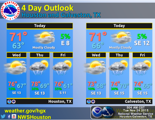 The last cool morning across SE TX until after Thanksgiving as increasing clouds and warming temps begin. Lows in the 60s and highs in the 70s approaching 80 for Thanksgiving. Rain and thunderstorm chances increase Thanksgiving day through the Thanksgiving weekend thanks to an active SW flow aloft and disturbances ahead of the next front which looks to move slowly across the area. Severe weather and flooding do not look to be threat for SE TX. Flooding could become a concern for portions of Central and NTX Thanksgiving weekend as the slow moving cold front combines with newly named TS Sandra's moisture from the EPAC.
