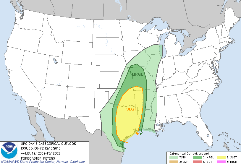 The Storm Prediction Center issues a Slight Risk for severe storms for Houston, Austin, Dallas/Fort Worth and Tulsa with their Day 3 Convective Outlook.(Saturday).