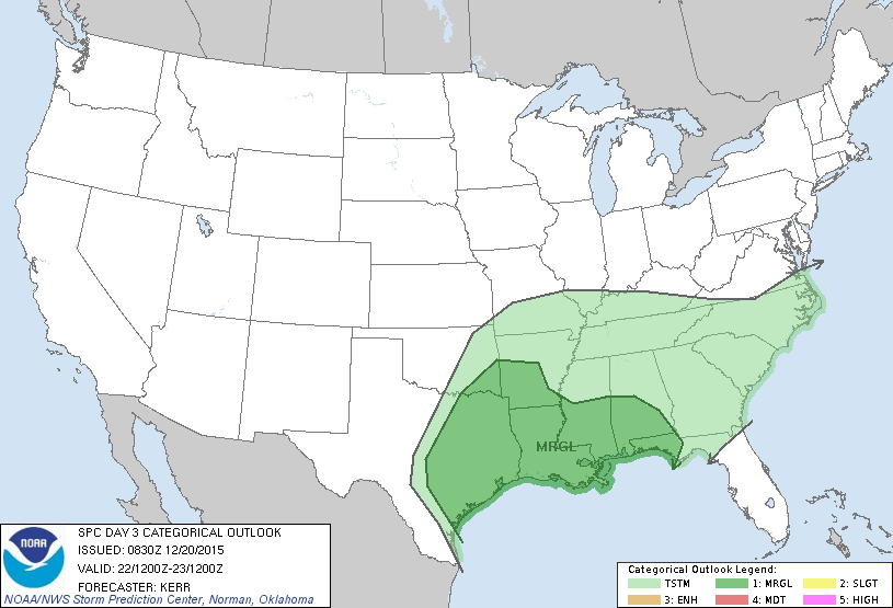 During this period, an area of heavy rain is predicted from the Gulf Coast northeastward across the mid-Atlantic and southern New England on December 21-22. About an inch of rain is anticipated from Virginia to New England, but 4-5 inch amounts are possible near the Gulf Coast from Louisiana to the western Florida Panhandle. Strong to severe thunderstorms are possible in this region, though for the time being no severe weather area is delineated on the map. This is due to uncertainty regarding the potential for prior convection near the Gulf Coast in association with an impulse originating over the subtropical East Pacific. It is currently unclear as to how much the convection associated with this impulse would destabilize the boundary layer in the Gulf Coast region.