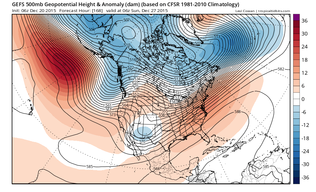 The weather pattern remains very volatile across North America with a very deep low pressure anomaly (Western trough) situated from the Pacific NW into the Great Basin/Desert SW into the Rockies. Such a pattern supports below normal temperature with a very unsettled and stormy Christmas Holiday period. A very strong SE Ridge is expected to keep areas along and East of the Mississippi River Valley very warm with temperature anomalies around 25F to 30F above normal. There is no sign of winter or significant changes across those Region for the foreseeable future. What that means for travelers heading East, chances of rain with a noisy and active subtropical jet feeding moisture from the Pacific as well as Gulf moisture streaming inland ahead of a stalled frontal boundary.snowman65 wrote:Has Christmas already flipped back again to warm??