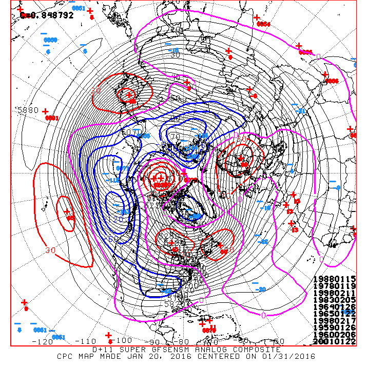 Climate Prediction Center Super Ensemble Day 11+ Analogs centered on January 31st: