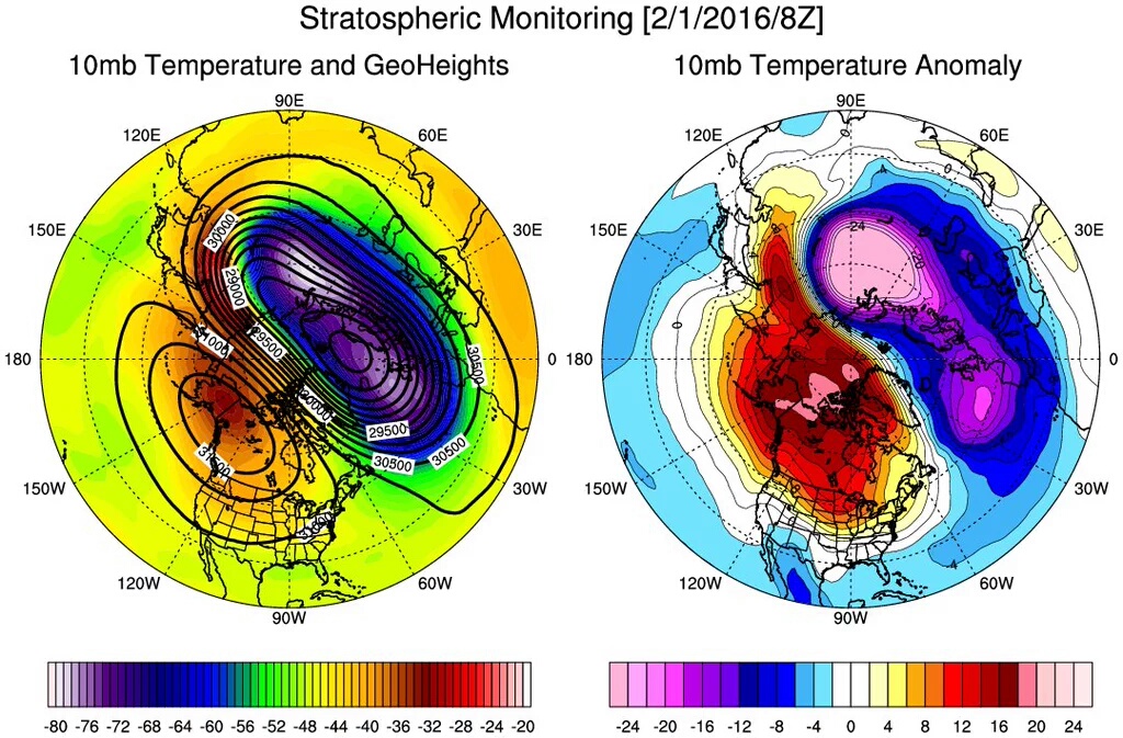 The overnight guidance continues to advertise a full latitude trough digging well South across North America. The guidance also suggests a Stratospheric Warming event across the Polar Region of the Northern Hemisphere with a strong blocking signature. The blocking signature is indicated by the orange 'U' shaped area from the West Coast to Greenland. The blue shades are indicative of full latitude trough with temperatures departures nearing the -20 degree range. There are growing indications that some areas may near 2 Standard Deviation below normal, temperature wise. Will this pattern translate to much colder for our Region? It's a bit too soon to know.
