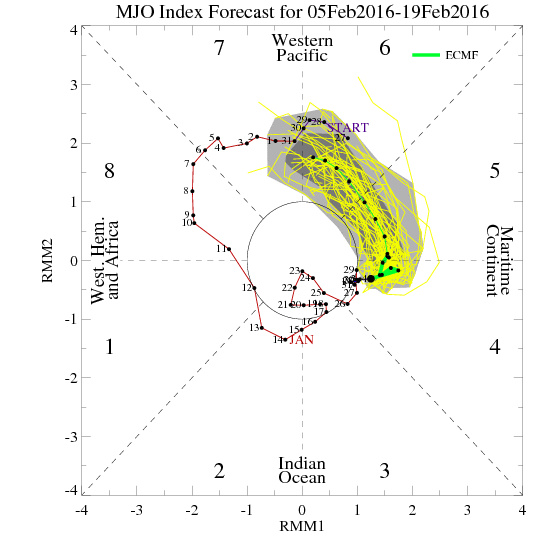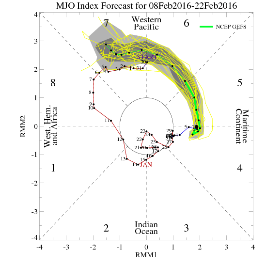 A quick update this morning regarding what we may expect in the mid to late February period for our Region. Currently a Significant Stratospheric Warming event is underway across the Polar Region, but most of the coldest air will be to our N and E due to the strong Western US Ridge associated with a +PNA (Pacific North American). The Arctic Oscillation is also positive as of this morning, but the ensembles are suggesting it will crash into negative territory as we approach Valentines Day. The PNA is expect to greatly relax toward a neutral state during that time frame as well as the MJO amplified orbit moving toward the Western Pacific. Typically the MJO should move into a Phase 8 Region suggesting a wetter phase for the Eastern Pacific/Western Hemisphere as we get into the mid to late February period. The models have been hinting of a big Spring like storm system in the 8 to 10 day range across the Southern Rockies/Southern Plains, so there may be some hope for a return to a wetter pattern for those lacking in the rainfall department. Enjoy the weekend and be aware of the elevated fire danger next week as those dry West to Southwesterly winds further dry us out. A wintertime elevated wildfire danger is not all that uncommon as vegetation has died of due to freezing temperatures across the Lone Star State. Hopefully the longer range pattern indicators are not a computer model mirage, but a potential real shot of a return of precipitation.