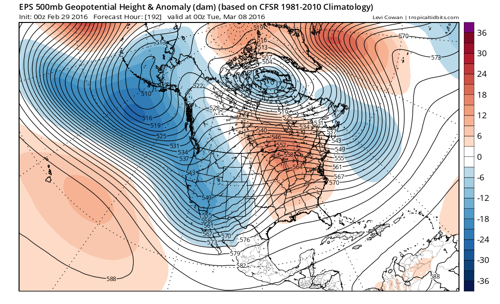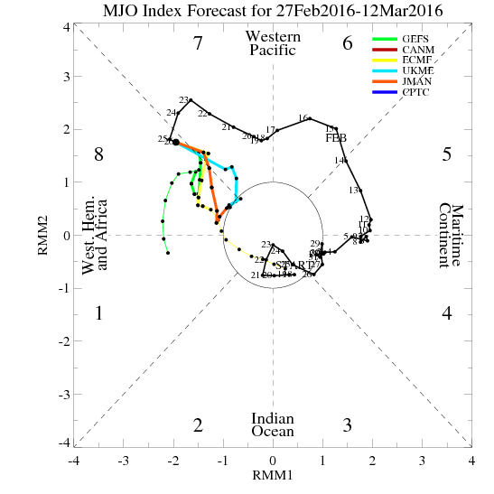 The overnight ensembles are beginning to suggest a rather big shift in the upper air pattern across North America. We have been under the influence of a rather stout Western/Central Ridge and the ensemble guidance is indicating a rather deep Western trough takes shape early next week with a couple of slow moving shortwaves that typically suggest a wet and potentially stormy pattern may develop. The MJO is in a favorable Phase 8 for the Eastern Pacific and the Western Hemisphere where we live, so we could see an active weather pattern begin to organize as there are no strong cold fronts expected to sweep well out into the Gulf. Pacific air should invade the West Coast later this week setting the stage for a potentially rainy period across the Western 2/3rds of Lower 48.