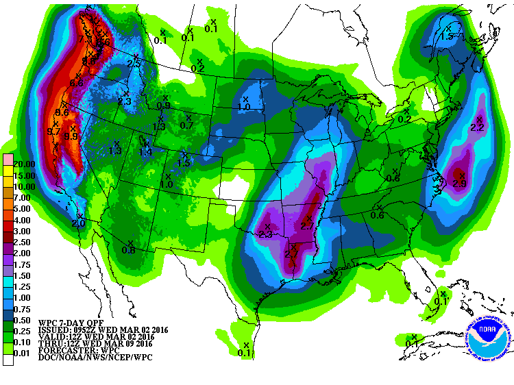 am concerned that the 10 year drought pattern, after a wet early Super El Nino spring last year, will re-affirm its grip (possibly aided by CC) where lows eject with energy to our north and eventually east. We see blustery SW wind and underperforming rain.
