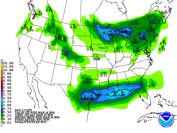 On Friday into Friday night a strong cold front will move into TX from the central plains while a well defined short wave approaches from the west. Strong lift comes to bear across the region Friday afternoon and evening and with moisture levels rising to 1.5-1.7 inch of PW heavy rainfall will be a concern. A few severe thunderstorms will also be possible during this period. Main concern is the heavy rainfall potential with deep convection working with a very moist air mass. Overall storm system is progressive and should clear the region Saturday morning, but a 12 hour or so window for heavy rainfall does exist Friday afternoon and evening. Will go with widespread rainfall amounts of .5-1.5 inches with isolated higher totals near 3 inches. Normally this amount of rainfall would not be much of a concern, but with saturated grounds and already flooding rivers….any additional rainfall is going to run-off.