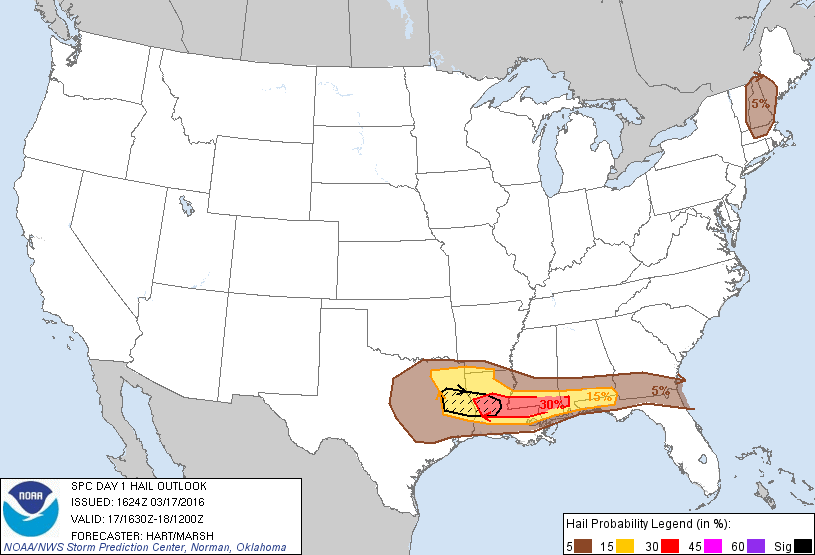 1630Z Updated Storm Prediction Center keeps a Marginal and Slight Risk with a Enhanced Risk of Severe Storms across portions of our Region which includes Louisiana. A Hatch Risked of Damaging Hail is indicated across portions of East and SE Texas mainly along and East of a Madisonville to Lake Livingston line.