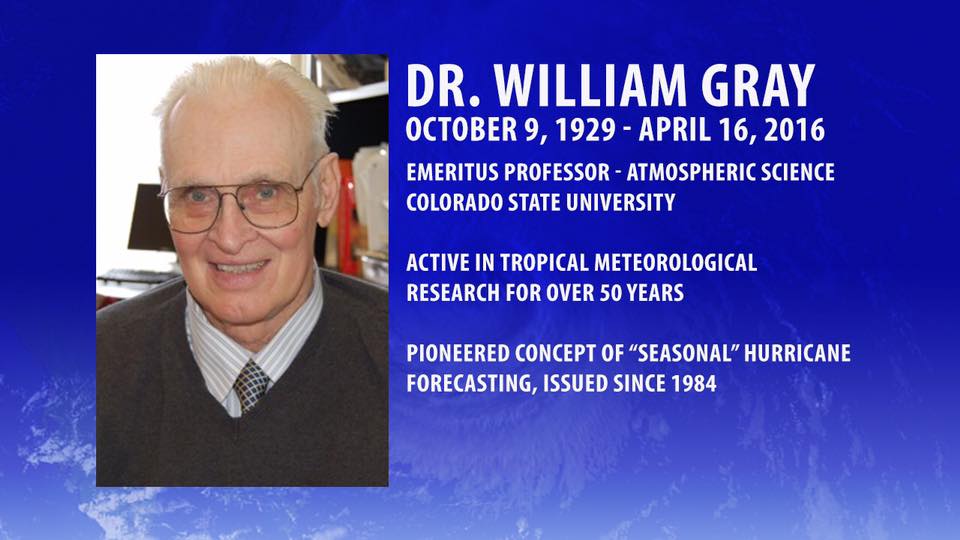 Dr. Gray had an incredible knowledge of the way that the climate works. His development of his genesis parameters – six key ingredients necessary for tropical cyclogenesis – was a groundbreaking piece of research when it was first published in the late 1960s. He also spent many years with his graduate students studying and publishing papers in a variety of fields from tropical cyclone structure to tropical radiation.