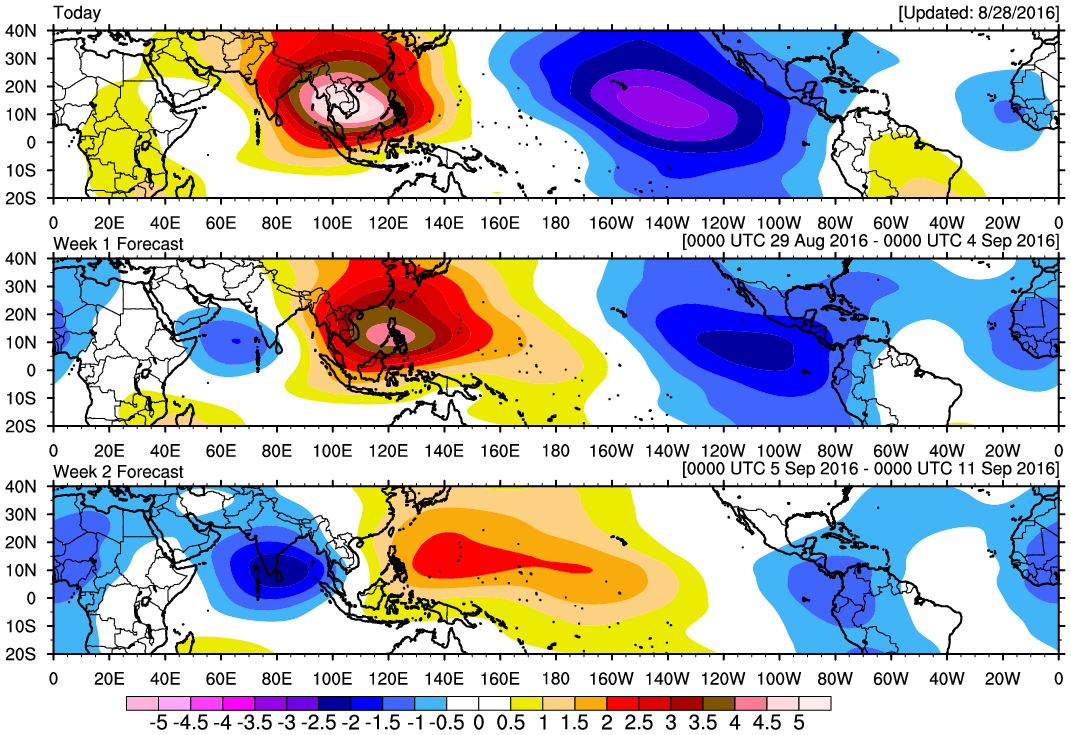 A strong tropical wave will emerge off the west coast of Africa around Tuesday of this week and continue to move westward at 15-20mph into the central Atlantic Ocean. There is good model agreement and support that this feature will develop has it moves westward across the Atlantic Ocean toward the Lesser Antilles. Large scale sub-tropical ridging is expected to build across much of the Atlantic behind the departing Hurricane Gaston and TD #8/99L. This will keep this developing tropical system moving on a generally westward track for the next several days.