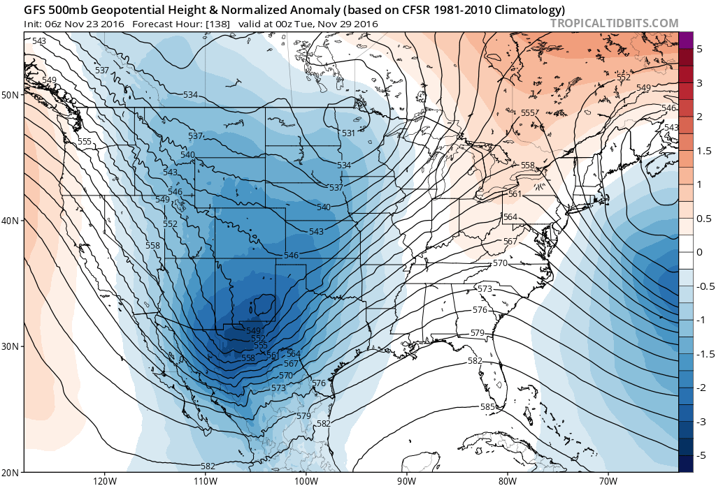 Next powerful storm system looks to be a slow mover and its impacts begin Saturday and last into early next week. Colder air mass will funnel southward ahead of this cutting off upper level storm over NW MX which will send waves of energy out of the eastern Pacific toward TX. Pattern is favorable for the formation of a strong coastal trough with widespread southerly winds overrunning cold NE surface winds. Pattern looks very wet through the period and model agreement has been high on this system and its prolonged impacts on the region. Highs may struggle to get much above 50 Saturday and Sunday with lows in the mid 40’s…so it is looking cold and wet for the first weekend in December. GFS continues to output some fairly impressive QPF numbers during this period…but this is likely a function of the prolonged overrunning event…although would not discount elevated instability to produce some elevated thunderstorms and heavy rainfall. Still a lot of details to work out during this period to firm up primary rainfall time and amounts along with surface temperatures.