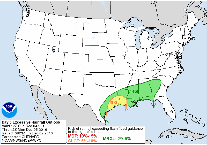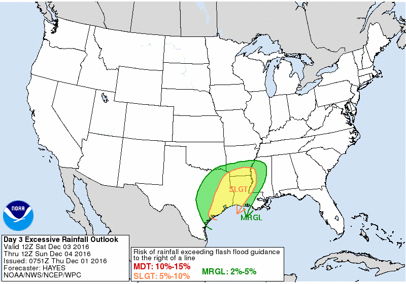 Review of flash flood guidance and NASA soil moisture satellite product shows fairly dry soil conditions over the area with 6-hr flash flood guidance over 4 inches and soil moisture around 25-35%. Think the rains Friday and Saturday will be handled and mainly go into saturating the soil. Bigger concern will come Sunday into Monday as soils become saturated and increasing run-off. This time will also feature the highest potential for excessive rainfall rates as the warm sector air mass moves inland and convection becomes more organized and sustained.