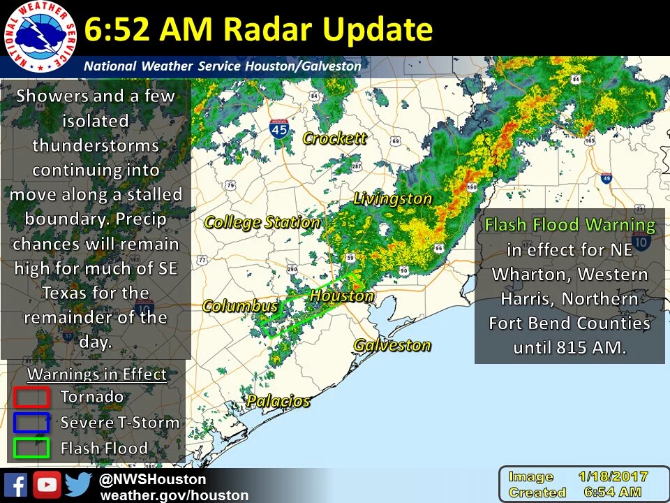 Another active weather morning across Central portions of SE TX making for a dangerous morning commute. High water is being reported with several bayous at or above flood stage in NW Houston. Remember "Turn Around Don't Drown!" this morning if you encounter high water this morning.