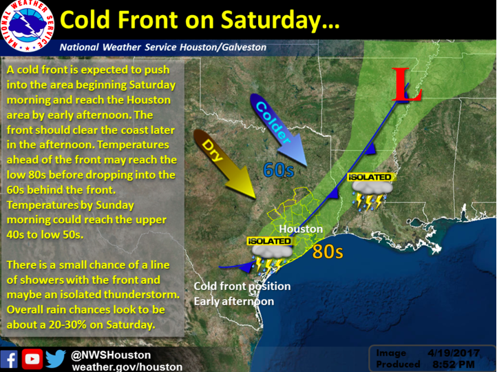 NTX thunderstorms have dissipated as they moved into SE TX early this morning. A few showers and an isolated thunderstorm will be possible along the cool front today. A very nice Saturday evening on the way followed by beautiful perfect Sunday weather.