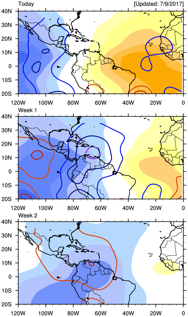 It appears the Tropical Atlantic will be quiet the next couple of weeks while the Eastern Pacific begins to become a bit more active which is somewhat typical for July.