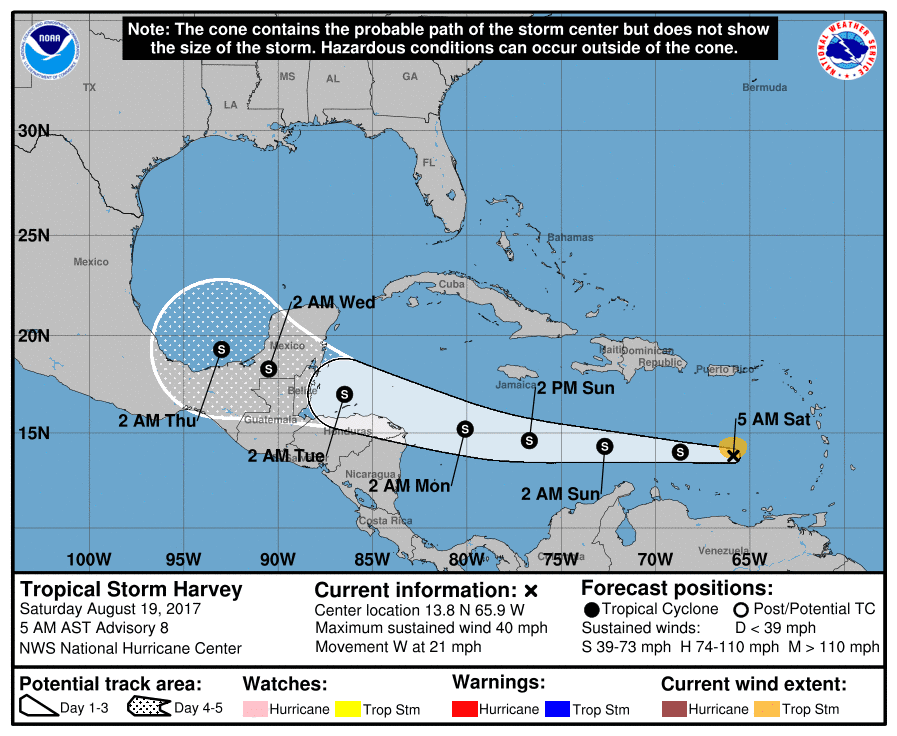 Saturday: August 19, 2017 (947am) Poorly defined Harvey moving quickly through the eastern Caribbean Sea.