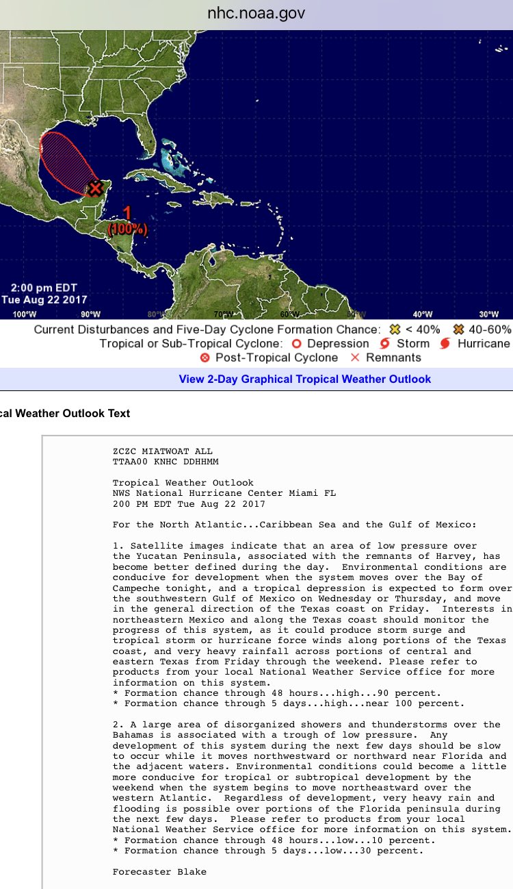 srainhoutx wrote:Overnight Harvey has come back to life from being an open wave in a highly sheared environment to that of what appears to be a developing Tropical Cyclone. Wind shear has collapsed as was expected and it appears an upper level Anticyclone has developed making for ideal conditions for intensification. We will see later today when RECON makes a trek out to investigate if Harvey is as strong as it looks on satellite this morning...if that deep organized convection persists. It serves as a reminder that we never take our eye off a Tropical Disturbance until its dead and gone, particularly when we are in late August and September.