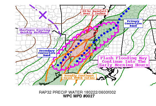 MESOSCALE PRECIPITATION DISCUSSION 0027 NWS WEATHER PREDICTION CENTER COLLEGE PARK MD 237 AM EST THU FEB 22 2018 AREAS AFFECTED...EAST TX...NRN/CTRL LA...SERN AR...NWRN MS CONCERNING...HEAVY RAINFALL...FLASH FLOODING POSSIBLE VALID 220736Z - 221300Z SUMMARY...CONTINUED HEAVY RAIN BANDS AND CONVECTIVE CELLS SHOULD CONTINUE TO MOVE OVER ALREADY SATURATED GROUND INTO THE DAYBREAK HOURS. THIS MAY ALLOW FOR ONGOING FLASH FLOODING TO PERSIST...OR FOR LOCALIZED AREAS OF NEW FLASH FLOODING TO DEVELOP. DISCUSSION...A VARIETY OF RAINFALL ESTIMATES (NSSL QPE, MRMS) AT 06Z INDICATED A BROAD SWATH FROM FAR EASTERN TEXAS INTO SOUTHEAST AND SOUTH-CENTRAL ARKANSAS HAS RECEIVED AT LEAST 2 INCHES OF RAIN IN THE PAST 24 HOURS. THE GROUND IN THIS AREA IS VERY LIKELY TO BE SATURATED...AND ONGOING FLASH FLOOD WARNINGS AND RECENT FLASH FLOOD REPORTS SUGGEST THAT AREAS OF FLASH FLOODING PERSIST AS OF 0730Z ACROSS PARTS OF THE REGION. GIVEN THE GROUND CONDITIONS AT THE PRESENT TIME...ANY ADDITIONAL RAINFALL COULD AGGRAVATE EXISTING FLOODING...OR CAUSE LOCALIZED AREAS OF NEW FLOODING TO DEVELOP. SOME FACTORS MAY COMBINE TO REDUCE THE OVERALL SCALE OF THE HEAVIER (1 IN/HR OR MORE) RAIN RATES OVER THE NEXT FEW HOURS...AND MAKE THE CONVECTIVE RAIN BANDS MORE SCATTERED IN GENERAL. A PROMINENT MID-UPPER LEVEL PV ANOMALY CENTERED OVER OKLAHOMA IS QUICKLY EJECTING NORTHEAST. THE ASSOCIATED NVA BEHIND THAT WOULD TYPICALLY FAVOR SOME LARGE-SCALE SUBSIDENCE...AND THE AREA WILL ALSO GET INTO THE RIGHT EXIT REGION OF AN UPPER LEVEL JET STREAK AROUND 09-12Z...SOMETHING ELSE THAT WOULD FAVOR SUBSIDENCE. FURTHERMORE...LOW-LEVEL FLOW IS PROJECTED TO BACK SLIGHTLY INTO THE MORNING HOURS WITH 850MB WINDS BECOMING SOUTHERLY AS OPPOSED TO SOUTHWESTERLY. THIS MAY INTRODUCE MORE DIRECTIONAL SHEAR THROUGH THE TROPOSPHERE AND INTERRUPT THE UNIFORM FLOW THAT HAS FAVORED TRAINING RAIN BANDS THROUGH MUCH OF THE NIGHT THUS FAR. THAT BEING SAID...BROADLY CONFLUENT...MOIST...AND UNSTABLE LOW-LEVEL INFLOW CONTINUES ACROSS THE OUTLINED DISCUSSION AREA. AND REGIONAL RADARS CONTINUE TO SHOW CONVECTIVE CELLS AND SMALL RAIN BANDS PUSHING NORTHEAST INTO THE SAME AREA. THE OVERALL THERMODYNAMIC ENVIRONMENT IS NOT EXPECTED TO CHANGE APPRECIABLY IN THE NEXT SIX HOURS...WITH MARGINAL INSTABILITY AND ABUNDANT DEEP MOISTURE. GIVEN THE PRESENCE OF HEAVY RAIN BANDS AT THIS TIME...THE OVERALL MESOSCALE ENVIRONMENT...AND THE CURRENT GROUND CONDITIONS...FLASH FLOODING SHOULD REMAIN POSSIBLE THROUGH THE EARLY MORNING HOURS. RAIN RATES OF UP TO 1.5 IN/HR COULD OCCUR WITH SUFFICIENT TRAINING OF CONVECTIVE CELLS. LAMERS ATTN...WFO...HGX...JAN...LCH...LZK...MEG...SHV...