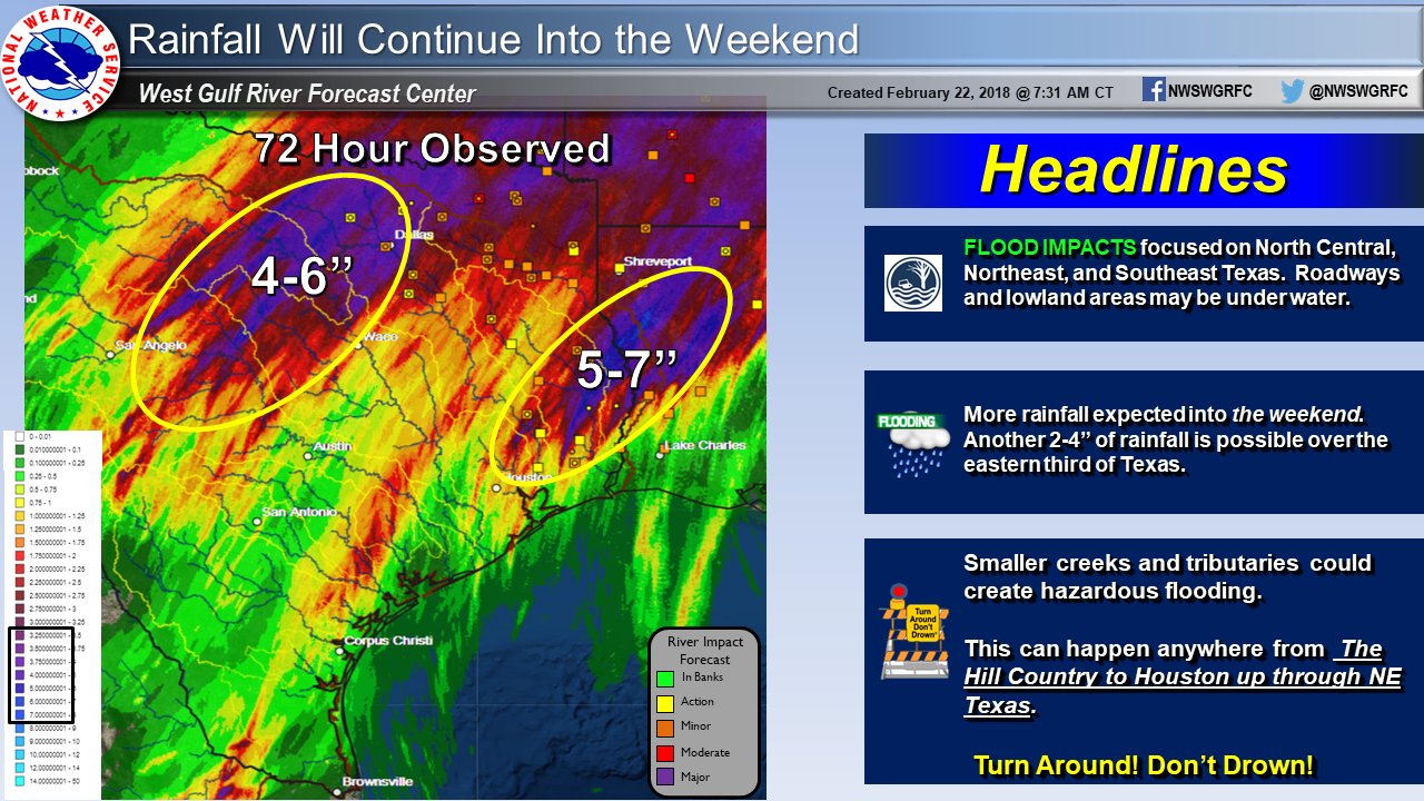 It continues to rain...and more rain is expected. Mainstem river flooding is forecast across most of E and NE TX. Maybe a break this weekend, before a return of precip next week. #txwx #txflood