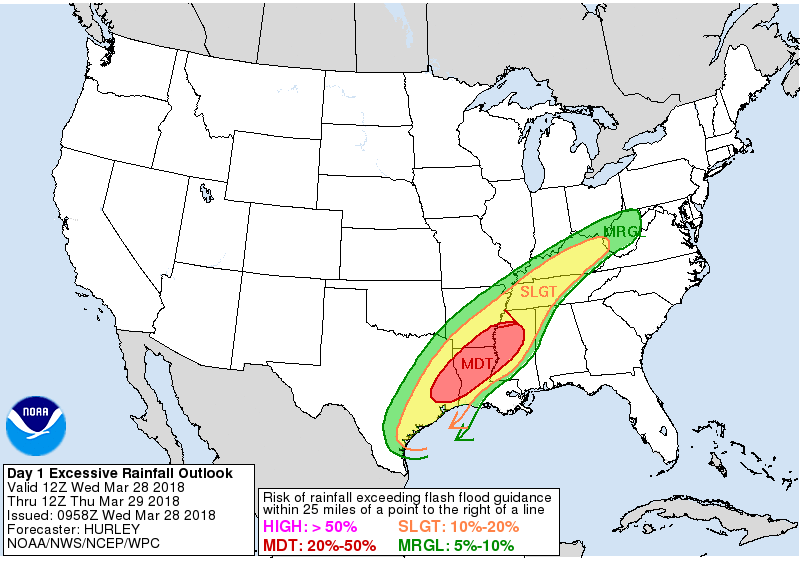 Overall hydrologic setting is better than late Feb with generally dry surface layers, a green up in vegetation, and near normal flow levels on at least the creeks and bayous. There will certainly be rises on creeks and bayous today with the forecasted rainfall amounts, but the main threat will be street flooding. The biggest concern areas for any type of minor channel flooding would be our usual areas that see rapid rises during such rains: