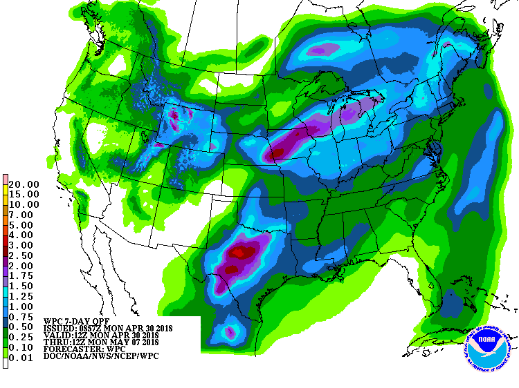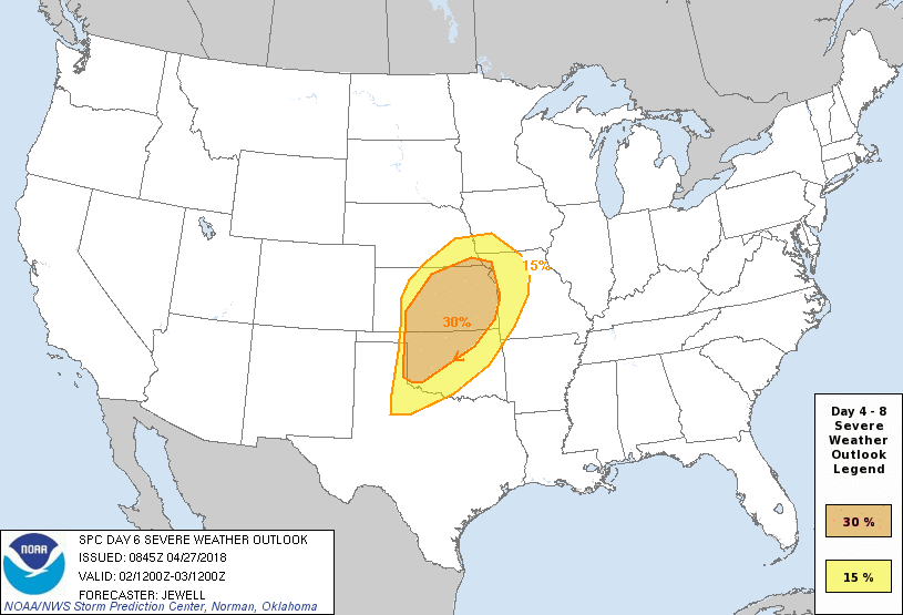 May looks to begin with an active weather pattern that could persist into the first full week or two of the month. Mid to late next week appear the most active as severe weather season in the Plains becomes active with a trough to the West and a Ridge to the East setting the stage for prolonged NW Gulf moisture to stream inland into the Plains and very strong dynamics. The Storm Prediction Center has Outlined a rather high 30% Chance of all modes of severe weather at Day 6 across potions of the Central/Southern Plains. As a cold front advances across Texas a week from today, strong to severe storms will some potential for heavy rainfall enters the forecast. Some of the guidance stalls that front near the Coast keeping generally unsettled weather around well into the following work week, but that's much to far out into the future to consider anywhere close to accurate. We will monitor next weeks data very closely and fine tune the sensible weather expected as we get a bit closer. Stay Tuned!