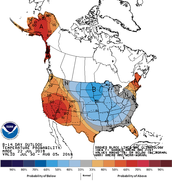 A general trough pattern East of the Rockies to the East Coast looks to extend into the early day of August with a chance for some isolated to scattered shower/storm chances throughout the rest of July into early August.